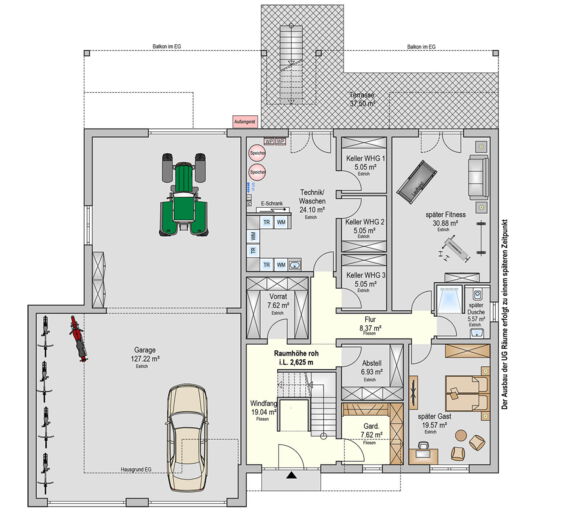 - Im Untergeschoss sind neben den Haustechnik-Räumen noch drei separate Keller, ein Fitnessraum sowie ein separates Gästezimmer mit Bad geplant