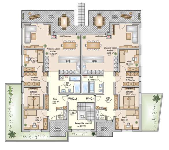 - Die beiden separaten Wohnungen im Erdgeschoss bieten auf jeweils ca. 115 m² Wohnfläche einen offenen Wohn-/Ess-/Kochbereich, zwei Kinderzimmer, ein Elternschlafzimmer mit separater Ankleide und zwei Balkone
