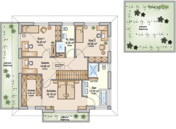 Das Dachgeschoss verfügt neben zwei geräumigen Kinderzimmern über das Elternschlafzimmer, ein Ankleidezimmer und ein großes Bad mit Wanne und begehbarer Dusche. Besondere Highlights im Dachgeschoss ist zum einen ein eigenes Kinderbad und eine luftige Galerie, welche viel Licht und Raum ins Haus bringt. Unter dem Dach steht sogar noch ein Bühnenraum zur Verfügung, welcher zusätzliche Staufläche bietet.