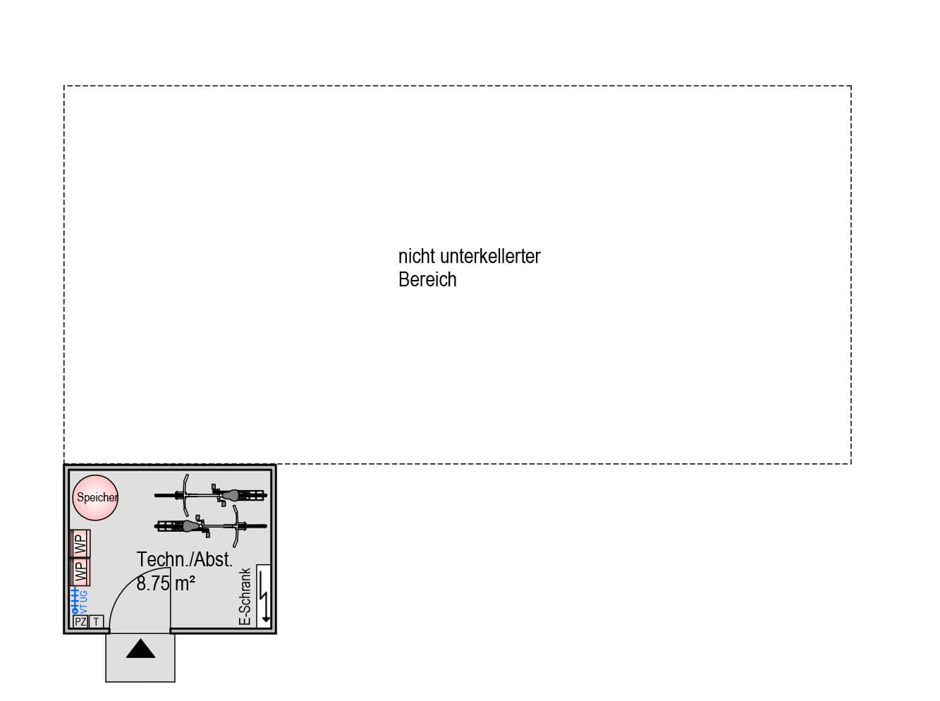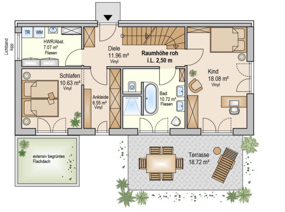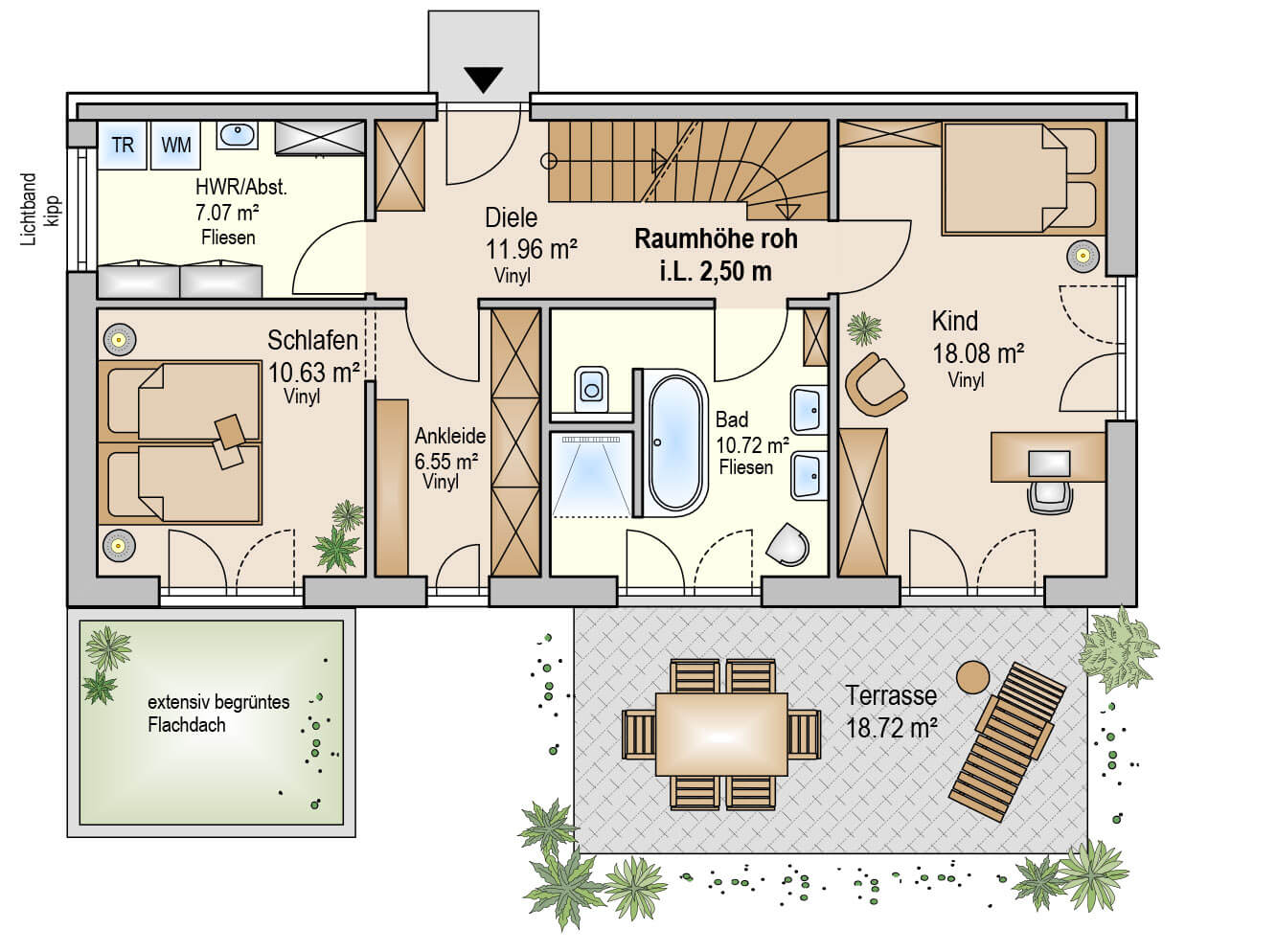 - Das Erdgeschoss ist für die Schlaf- und Kinderzimmer sowie das Bad und den Hauswirtschaftsraum vorgesehen. Kinderzimmer und Bad führen durch bodentiefe Fenster direkt auf eine vorgelagerte Terrasse