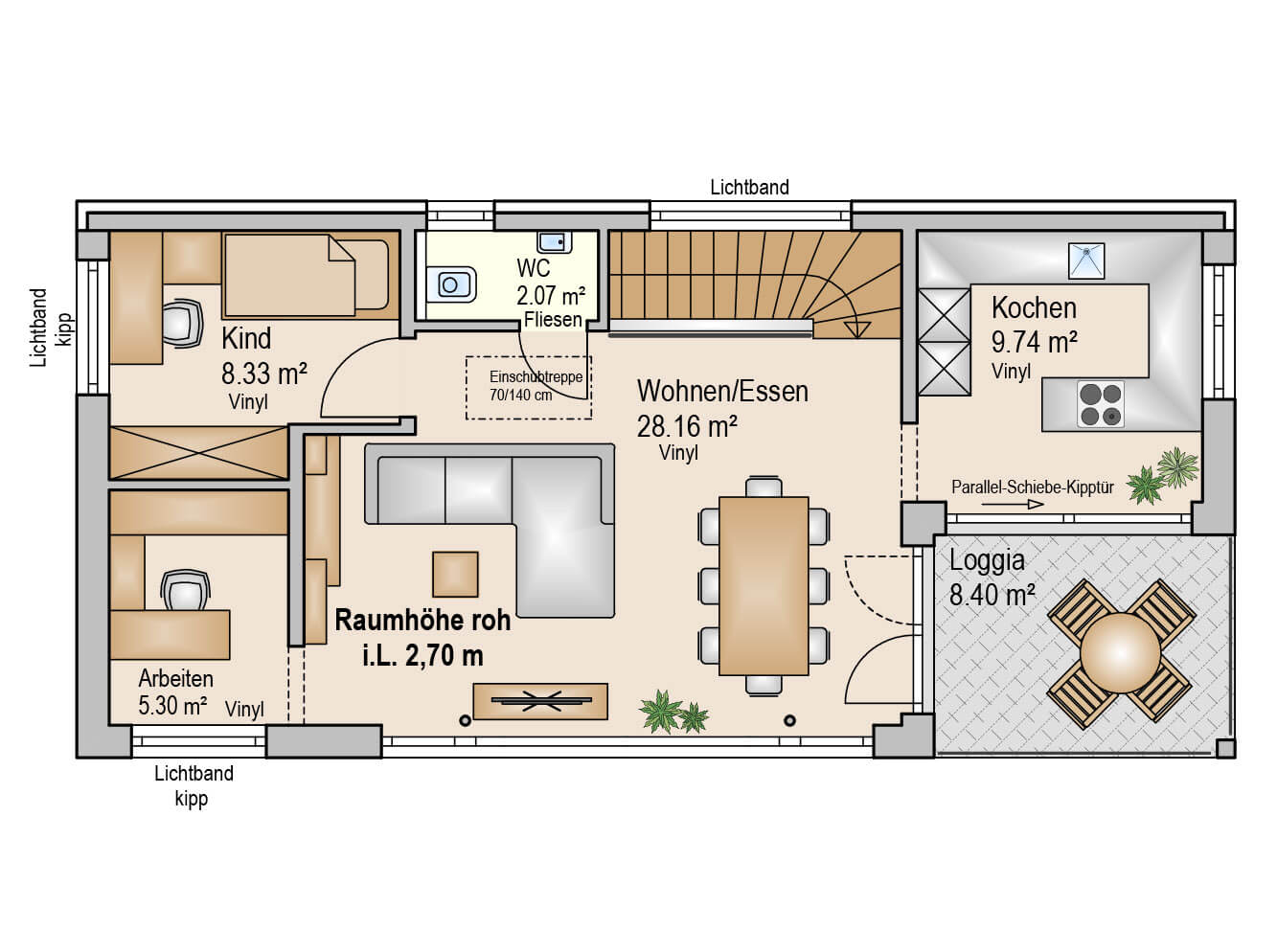 - m Obergeschoss sind die Wohnräume geplant: Ein großer, offener Wohn-/Essbereich mit einem großen, bodentiefen Panoramafenster, die kompakte Küche, ein weiteres Kinderzimmer, ein Arbeitszimmer sowie eine gemütliche Loggia bieten später eine tolle Aussicht aus dem Obergeschoss. Ideal ist diese Planung vor allem für Häuser am Hang bzw. auf Grundstücken mit umliegender Bebauung im Erdgeschoss-Bereich – aus dem Obergeschoss ist dann der Blick über die Nachbarhäuser gewährleistet und bietet so auch in eng bebauten Baugebieten die Möglichkeit, Aussicht und Raum zu genießen